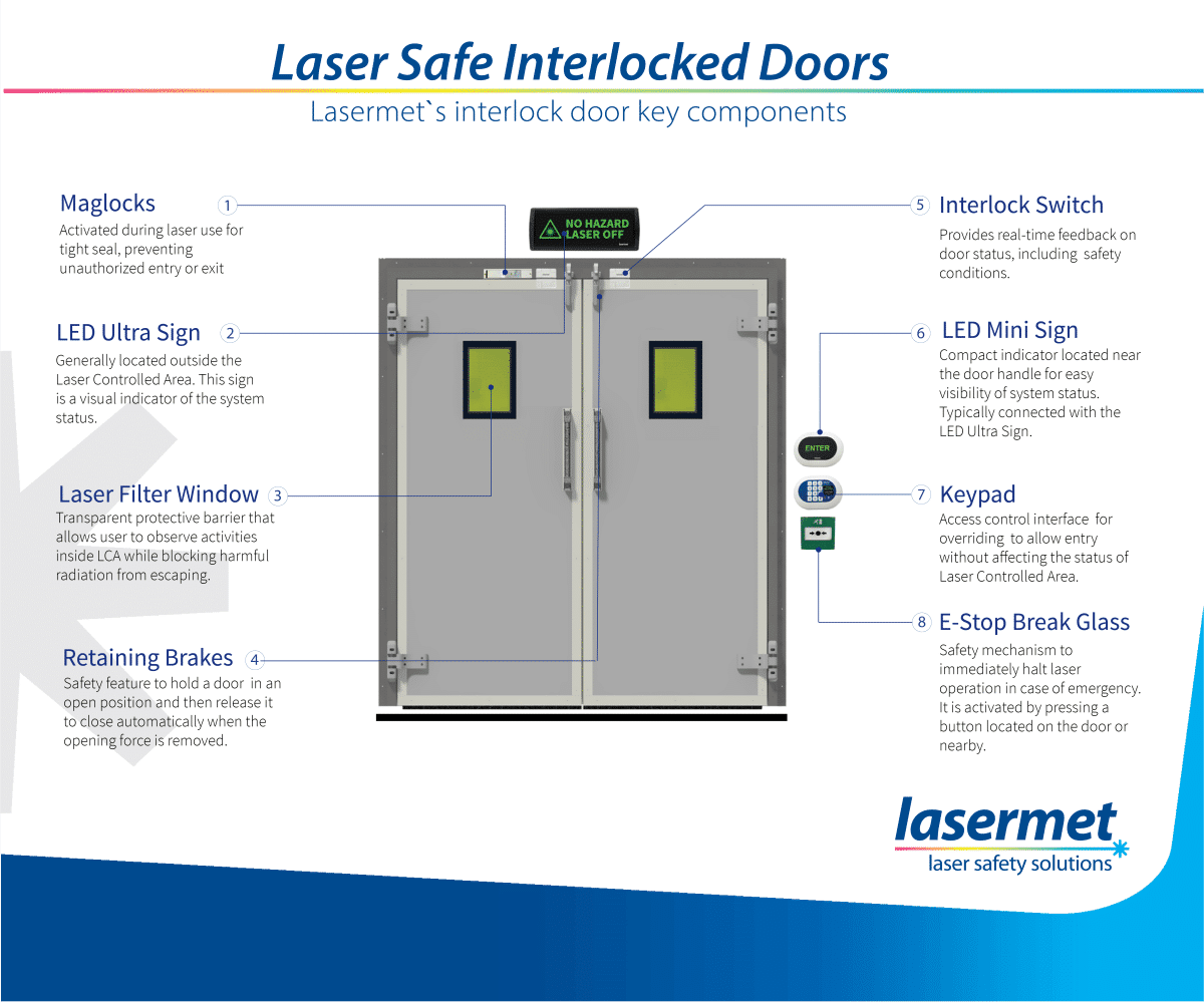 In lasergesteuerten Bereichen hat die Sicherheit von Personal und Ausrüstung höchste Priorität. Lasermet empfiehlt daher lasersichere Verriegelungstüren als optimale Lösung für alle Laserlabore und Räume, in denen Laser eingesetzt werden. Dies ist eine umfassende Lösung zur Minimierung der Risiken durch Laserstrahlung und optimiert gleichzeitig die Betriebsabläufe und Arbeitsprozesse.