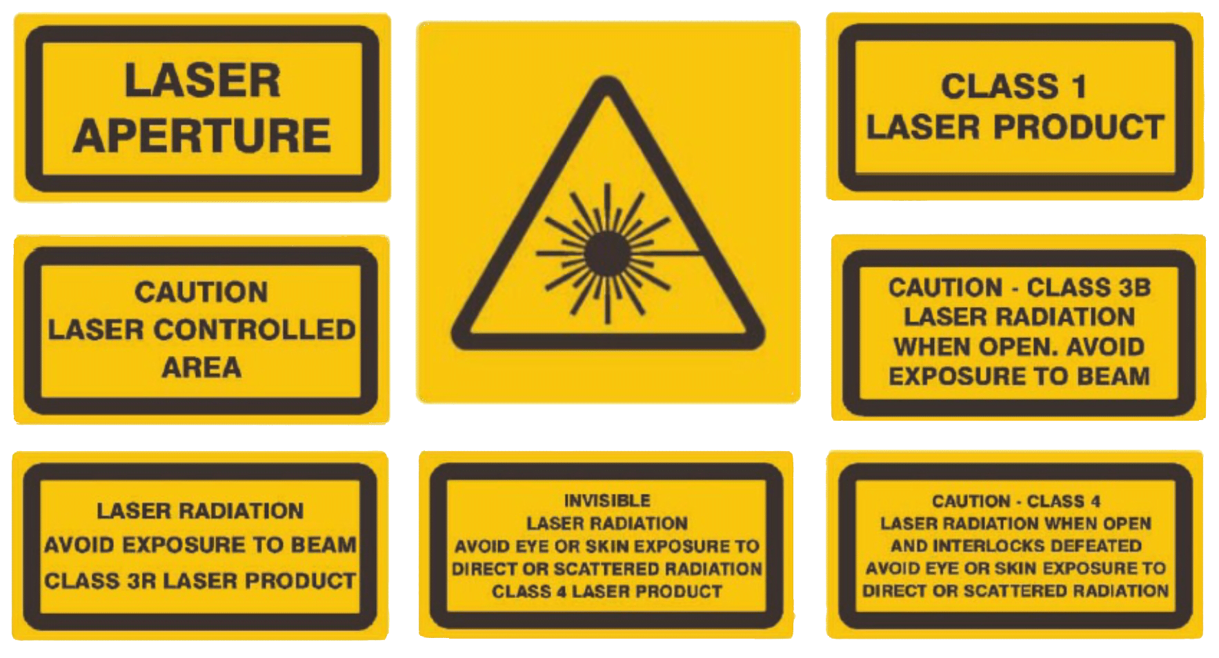 Die Norm EN IEC 60825-1 legt einige Arten von Laserwarnschildern fest, die Sie auf Ihrem Laserprodukt anbringen sollten.