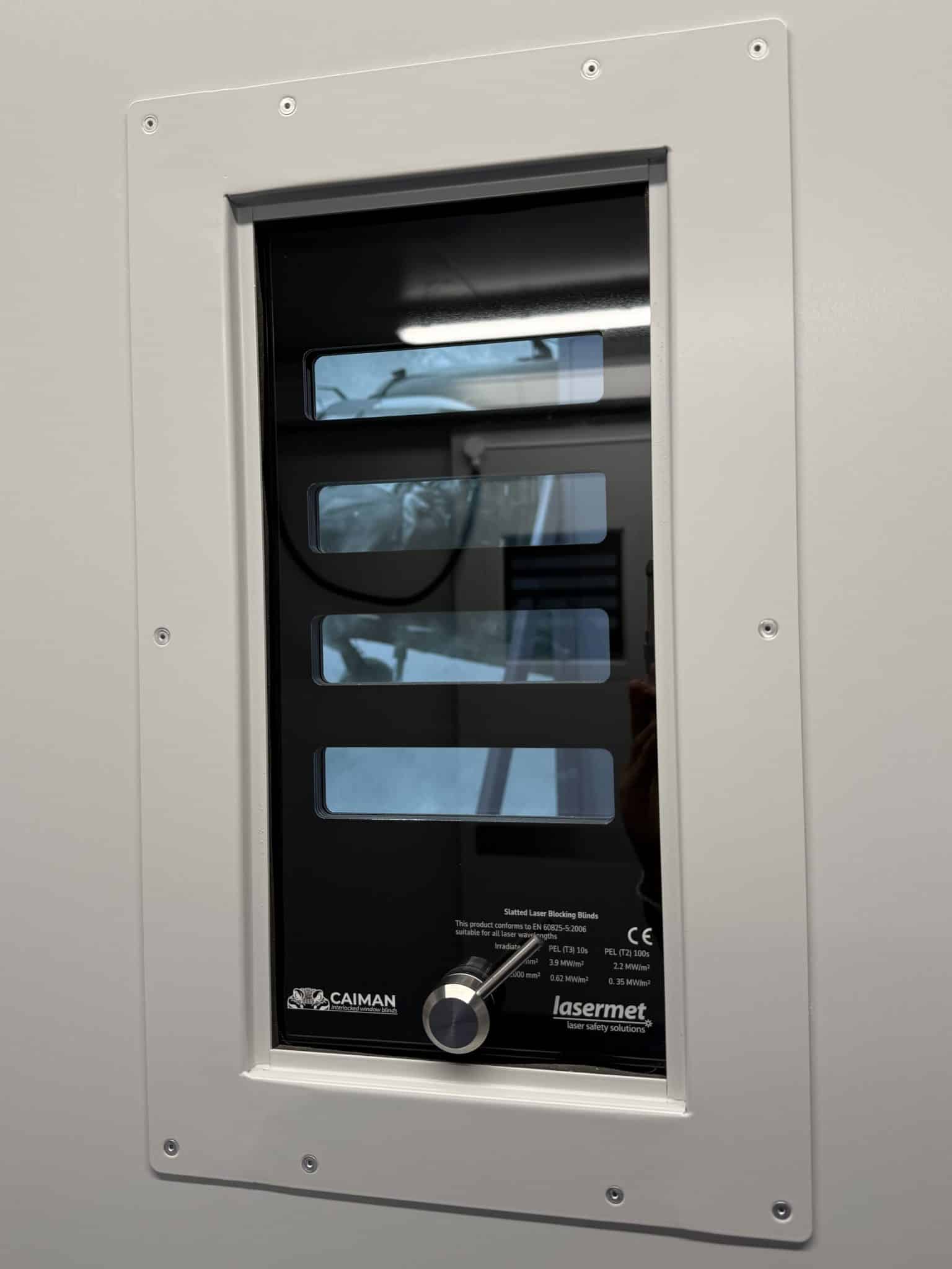 The slats of the Caiman Window are made of a special polycarbonate composite material with laser-blocking properties, specifically designed to shield against stray laser beams while maintaining visibility. This makes it ideal for environments where uncontrolled laser reflections could pose a risk.