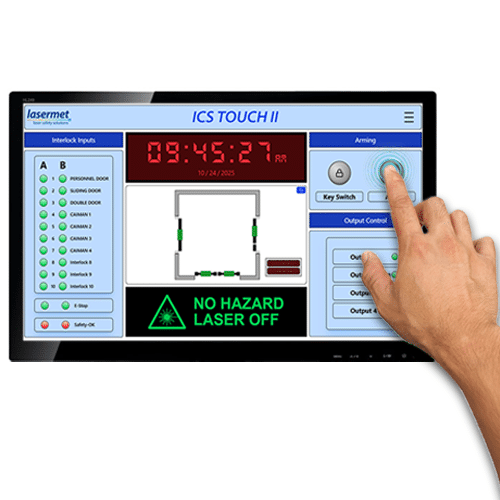 The ICS‑TOUCH II is Lasermet’s next-gen upgrade to the standard touchscreen interlock controller, tailored for medical-grade laser systems. Like its predecessor, it provides full dual-channel safety, interlock monitoring, and secure arming—but adds a larger touchscreen display, enhanced monitoring of up to 10 inputs, and integration with multi-laser environments and CALM monitoring systems.